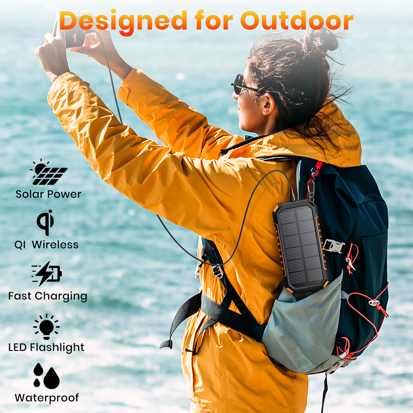 Wireless Portable Charger with USB C Input/Output Fast Charge 3.0A Solar Charger External Battery with Flashlight for Phone, Tablet and Camping Outdoors